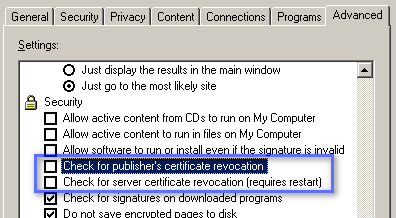 - Make sure the Check for publisher’s certificate revocation and Check for server certificate revocation options are unchecked