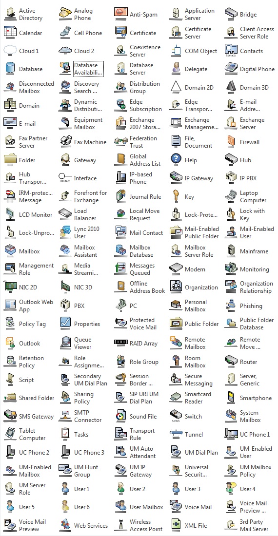 A quick post, but helpful for all those involved with designing and drawing out infrastructure diagrams related to Microsoft Exchange Server. Microsoft published Visio stencil with shapes for Microsoft Exchange Server 2010 (RTM and SP1). These shapes include icons for the following: