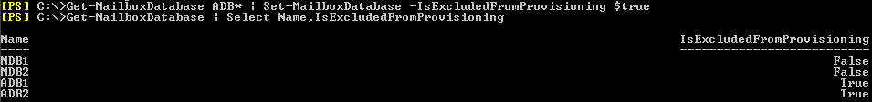 Now, when you haven’t already done so, first exclude the mailbox databases containing personal archives from automatic provisioning. If you have a dedicated server for hosting personal archives, use the IsExcludedFromProvisioning with the Set-MailboxServer cmdlet; to exclude a mailbox database use IsExcludedFromProvisioning with the Set-MailboxDatabase, e.g.