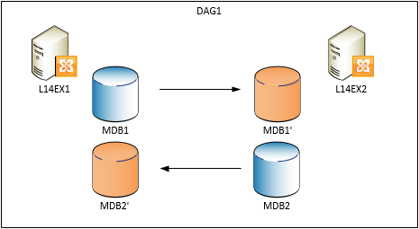 For this blog I use a small setup which consists of a single DAG (DAG1) with member servers L14EX1 and L14EX2 hosting two databases, MDB1 and MDB2; both servers host an active copy.
