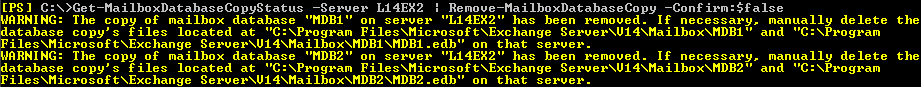 Get-MailboxDatabaseCopyStatus –Server L14EX2 | Remove-MailboxDatabaseCopy –Confirm:$false