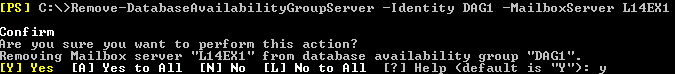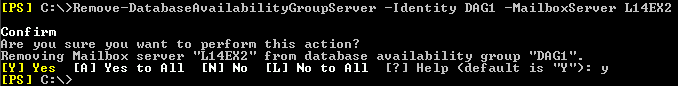 Remove-DatabaseAvailabilityGroupServer –Identity DAG1 –MailboxServer L14EX2