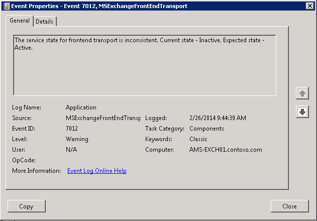 The application event log will contain event log entries ID 7012, generated by the MSExchangeFrontEndTransport, mentioning that “The service state for frontend transport is inconsistent. Current state – Inactive. Expected state – Active”: