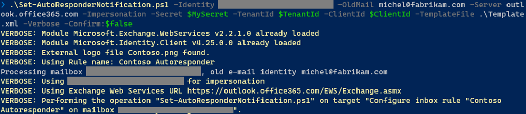 Here, the autoresponder will get configured on the specified mailbox, triggering when mail has been sent to michel@fabrikam.com using the configuration defined in template.xml. Modern authentication will be used for authentication, using variables for Tenant, Client and in this case secret.