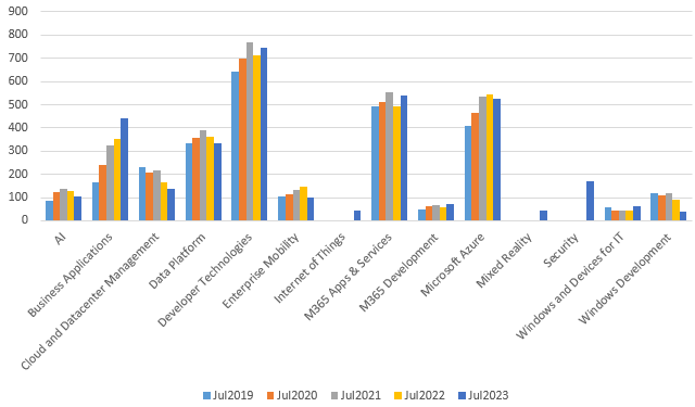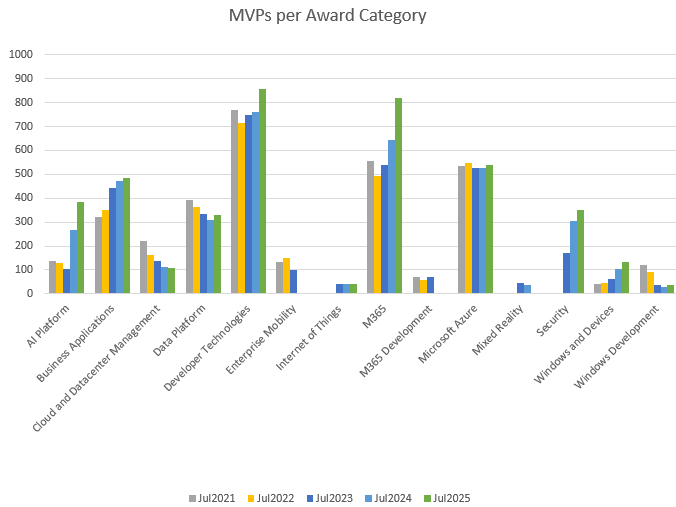 The numbers below are taken from the public MVP portal on July 30th. Comparing them to July from recent years should give an idea of trends and what award categories (and thus products) have focus.