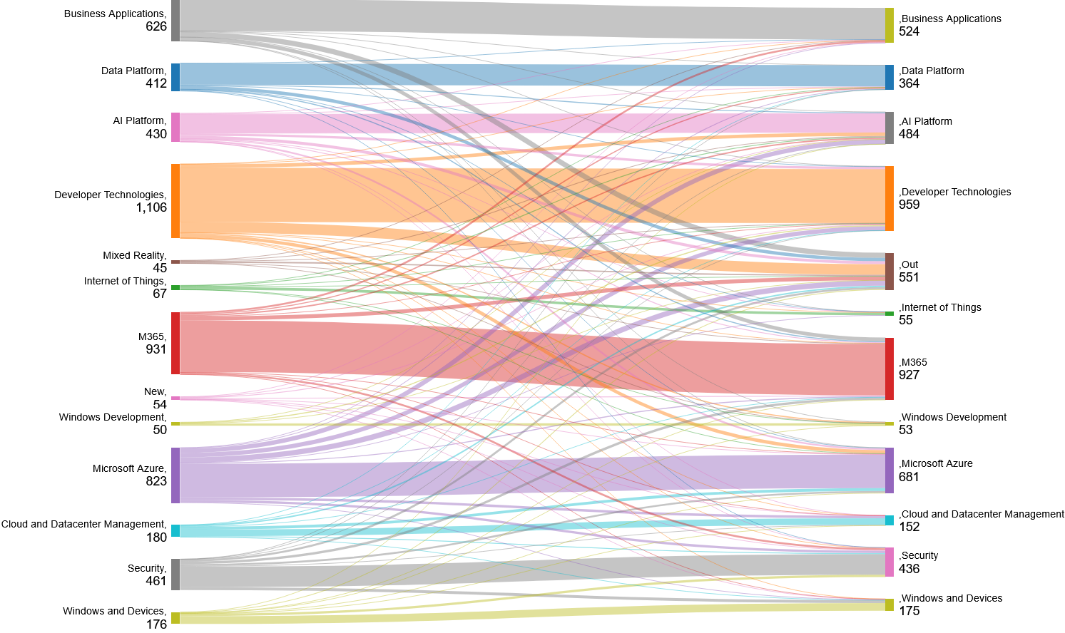 The Sankey diagram below displays the number of awarded categories moving from last year to now. The move is based on the MVP, the categories they had, and the new categories they have currently been awarded in. New awardees are categorized as “New,” and those who are no longer present on the MVP portal (e.g., no longer MVP) are categorized as “Out.”