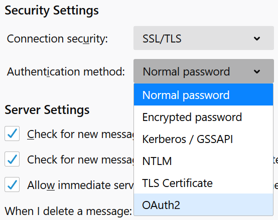 If Thunderbird can’t figure out your settings (for some reason the Windows build could, but the Ubuntu build couldn’t), configure them as indicated above. We can’t select OAuth2 for authentication here, so leave Authentication as is; we will correct this right after we click Done.