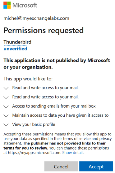 Another thing to note is that permissions for Thunderbird app will have been translated to the following Graph permissions: