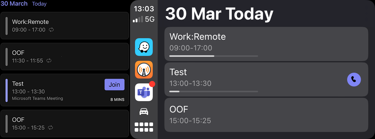 The picture below shows the Calendar View both on Teams Mobile (left) and the corresponding view as displayed on Teams for iOS with CarPlay (right). It shows our Test meeting which is currently in progress, as indicated by a progress bar as well.