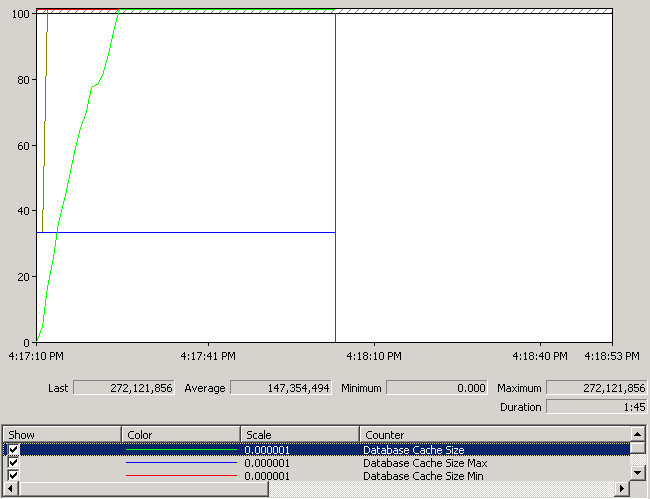 After restarting the Information Store and putting on some load on the Exchange server, you will see that the allocated database cache (green line) rises above the configured maximum (blue line).