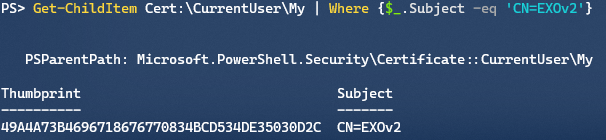 Get-ChildItem Cert:\CurrentUser\My | Where {$_.Subject -eq 'CN=EXOv2'}