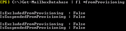We first checked the more or less obvious, which is to see if databases are not excluded from the provisioning process, so we entered Get-MailboxDatabase | fl *FromProvisioning: