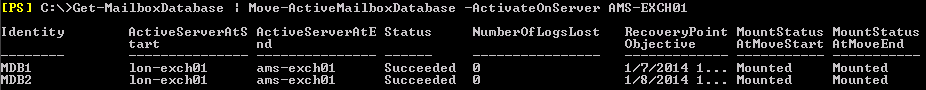 The copies looked healthy, but we noticed all databases were mounted in a remote site (derived from the server name starting with LON; we’re working from AMS). Looking back at the database selection process, it explained why it probably didn’t work and since the active copies should be moved back to the preferred site AMS anyway we moved the active copies back: