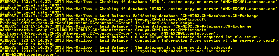 Note that we could have discovered the issue using the Verbose parameter with the cmdlet. For example, New-Mailbox in conjunction with Verbose will show the selection process. The following screenshot shows an unsuccessful selection process considering available databases: