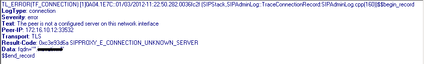 After establishing a TLS session (so SIP secured was configured properly on both sides), the Lync Server received a SIP OPTIONS request after which it actively terminated the connection returning “The peer is not a configured server on this network interface” . The details section of this message displayed the following: