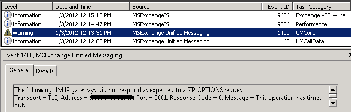 I started off by inspecting the eventlog on the Exchange Server. Here I noticed UMCore process generated event 1400 periodically when trying to contact the UM IP gateway (Lync server):